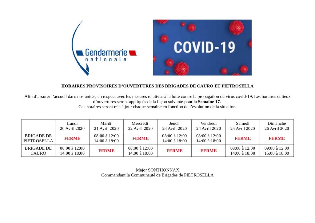Retrouvez les horaires d’ouvertures des brigades de Pietrosella et de Cauro pour la Semaine du 20 au 26 Avril 2020