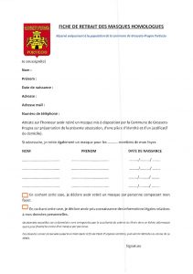 Vous devrez vous munir du document dument complété « fiche de retrait de masques » à télécharger ci-dessous ou le remplir directement sur les lieux de retrait et présenter obligatoirement :