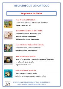 - Jeudi 6 Février à 16h30 : Lecture d’une histoire sur le thème de la chandeleur (enfants à partir de 4 ans)