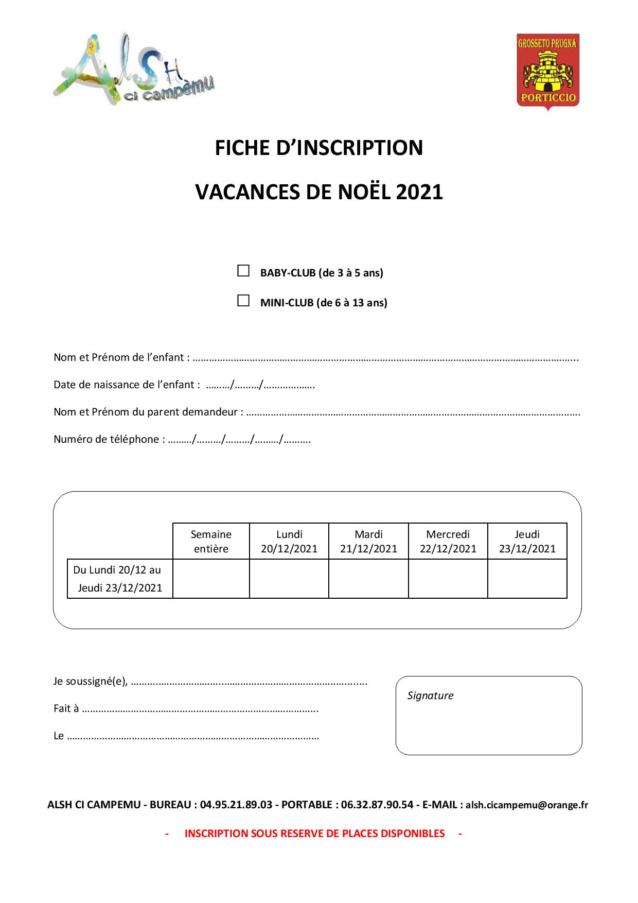 FICHE D'INSCRIPTION - VACANCES DE NOEL 2021