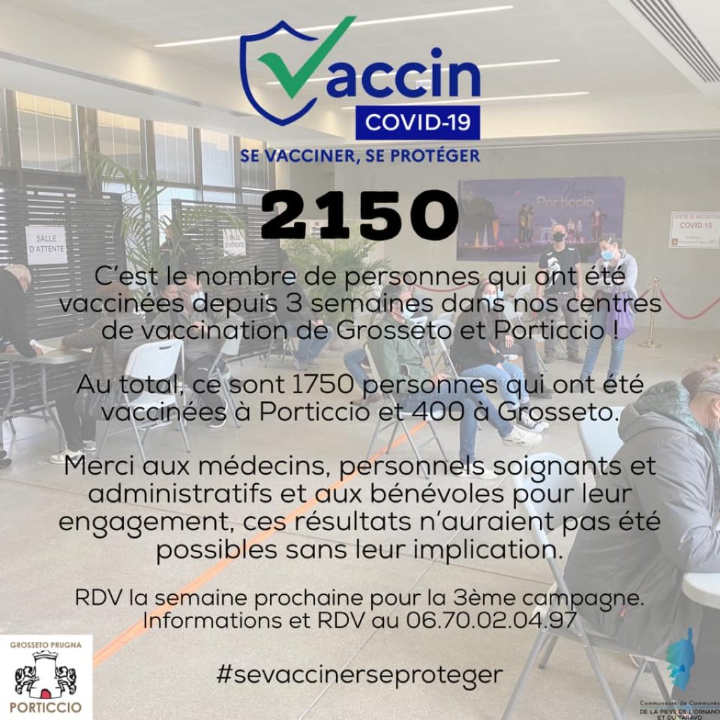 Le centre de vaccination de Porticcio vous propose une nouvelle session les Jeudi 22, Vendredi 23 et Samedi 24 Avril de 08h à 20h ainsi que le Dimanche 25 Avril 2021 de 08h0 à 16h à Porticcio,  dans les locaux du pole culturel.